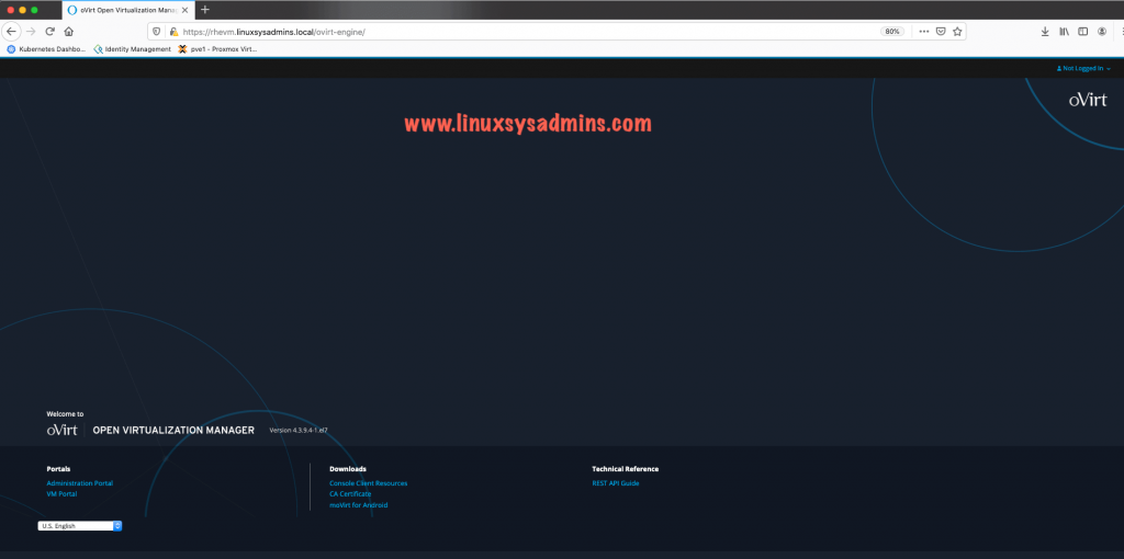 It’s time to access the admin portal using the IP or domain name. In my case https://rhevm.linuxsysadmins.local/. Click on Administration portal at the bottom left side corner to access the Ovirt Manager.
